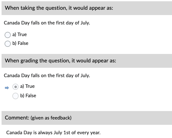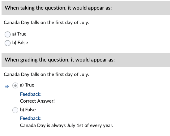 Only use the words True and False as answer options or the question becomes a Multiple Choice type.